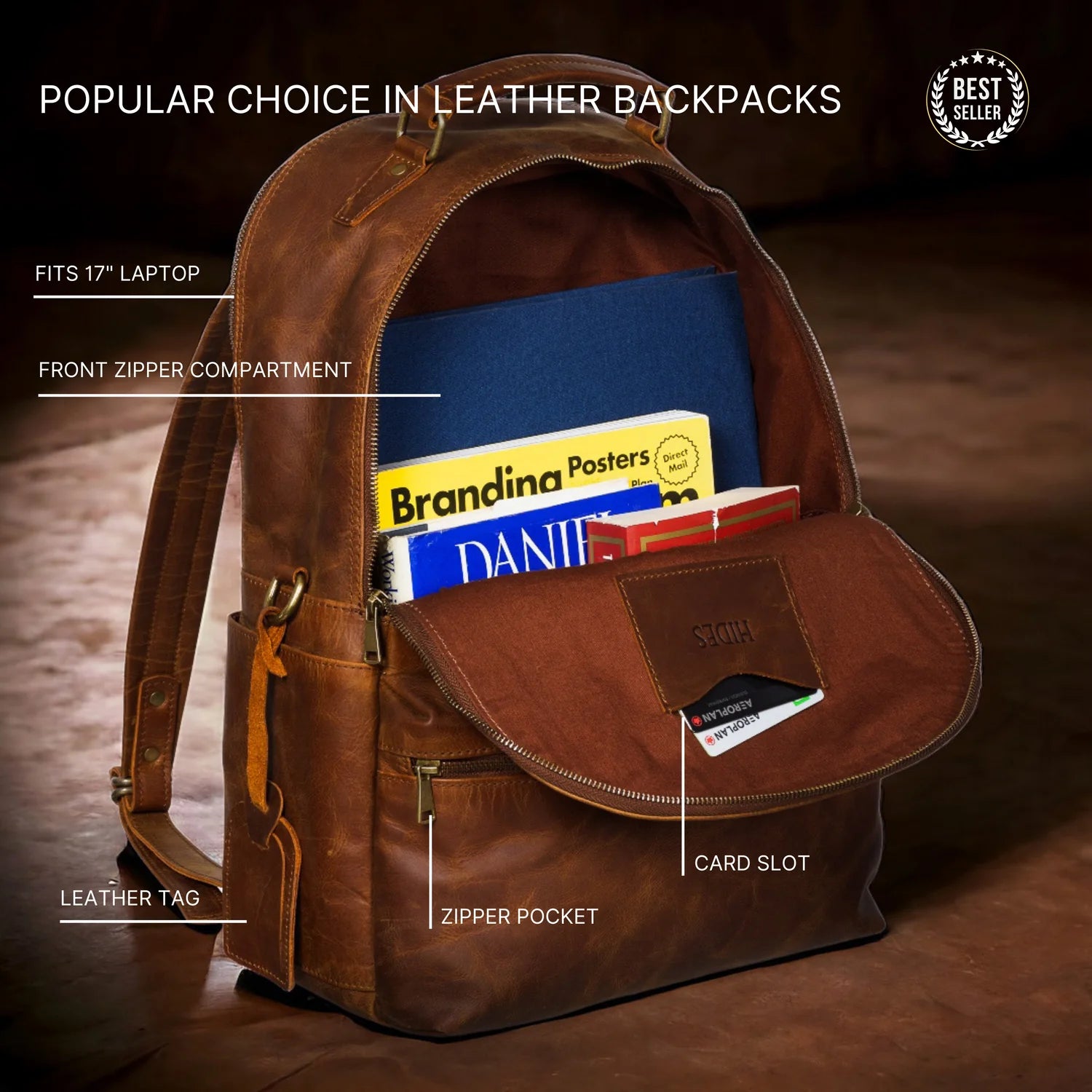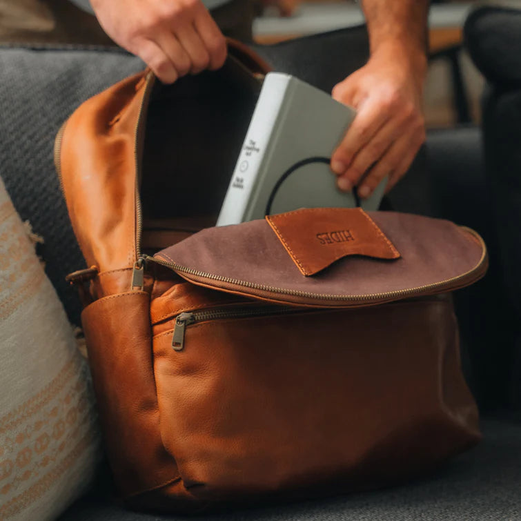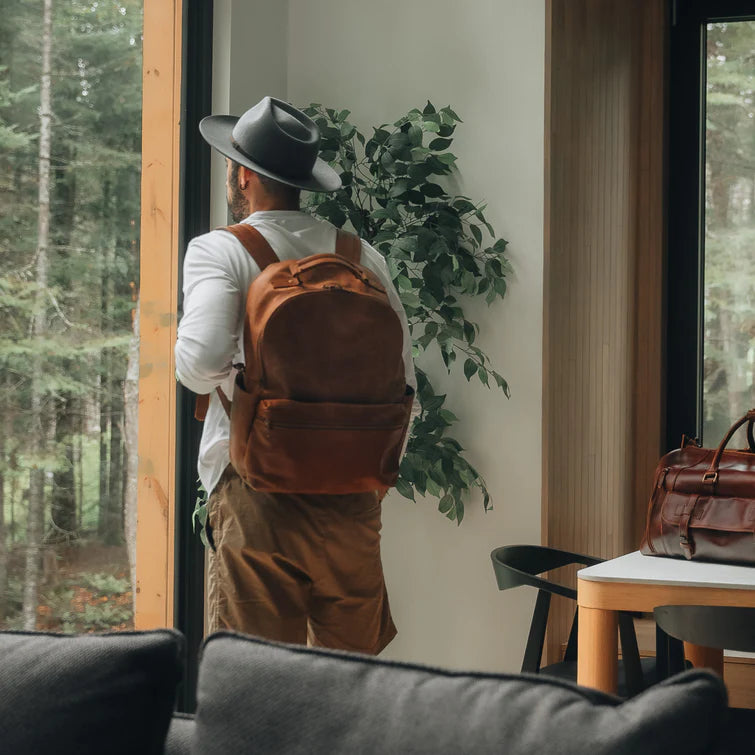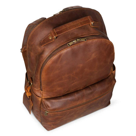 Made from full-grain leather, the Leather Backpack Rucksack symbolizes slow fashion and outstanding craftsmanship. It has a dedicated compartment for a 17-inch laptop, featuring a key fob, pen sleeves, card slot, phone pocket, and a trolley sleeve. Perfect for travel and daily use.