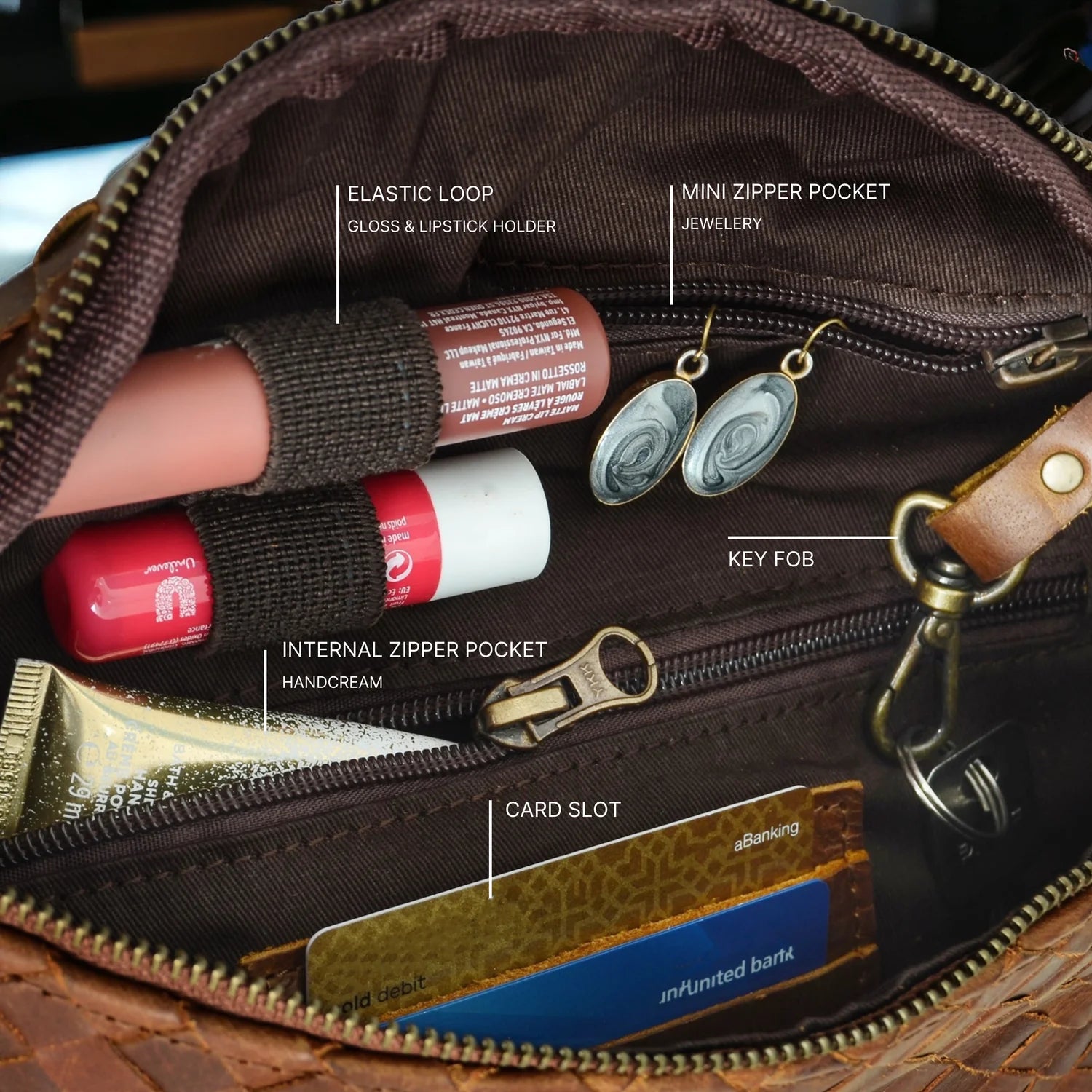 - 2 inner elastic loops designed to hold your lipsticks and similar essentials